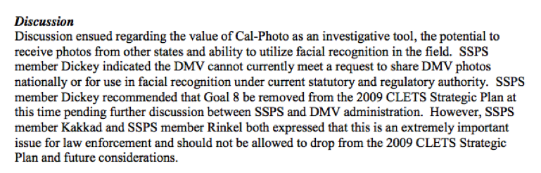 At the next SSPS meeting in December 2014 [PDF], members reported that they had met with the DMV director, who reiterated that several laws stand in the way of photo-sharing and even more statutes would block the implementation facial recognition. The delegate from the California Peace Officers’ Association shrugged that off, saying he believed a review of the statutes would indicate that law-enforcement access would “probably be appropriate.”