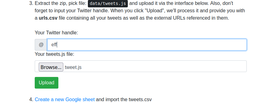 - Fill in your Twitter handle, select your "tweets.js" file from Step 2 and click "Upload."