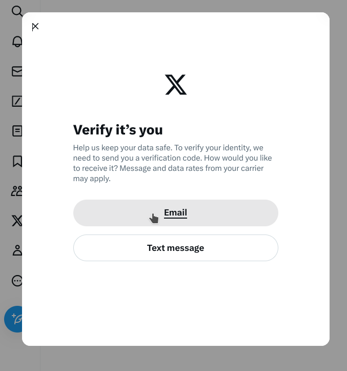 - You'll be prompted to sign into your account again, and X will need to send a verification code to your email or text message. Verifying with email may be more reliable, particularly for users outside of the US.