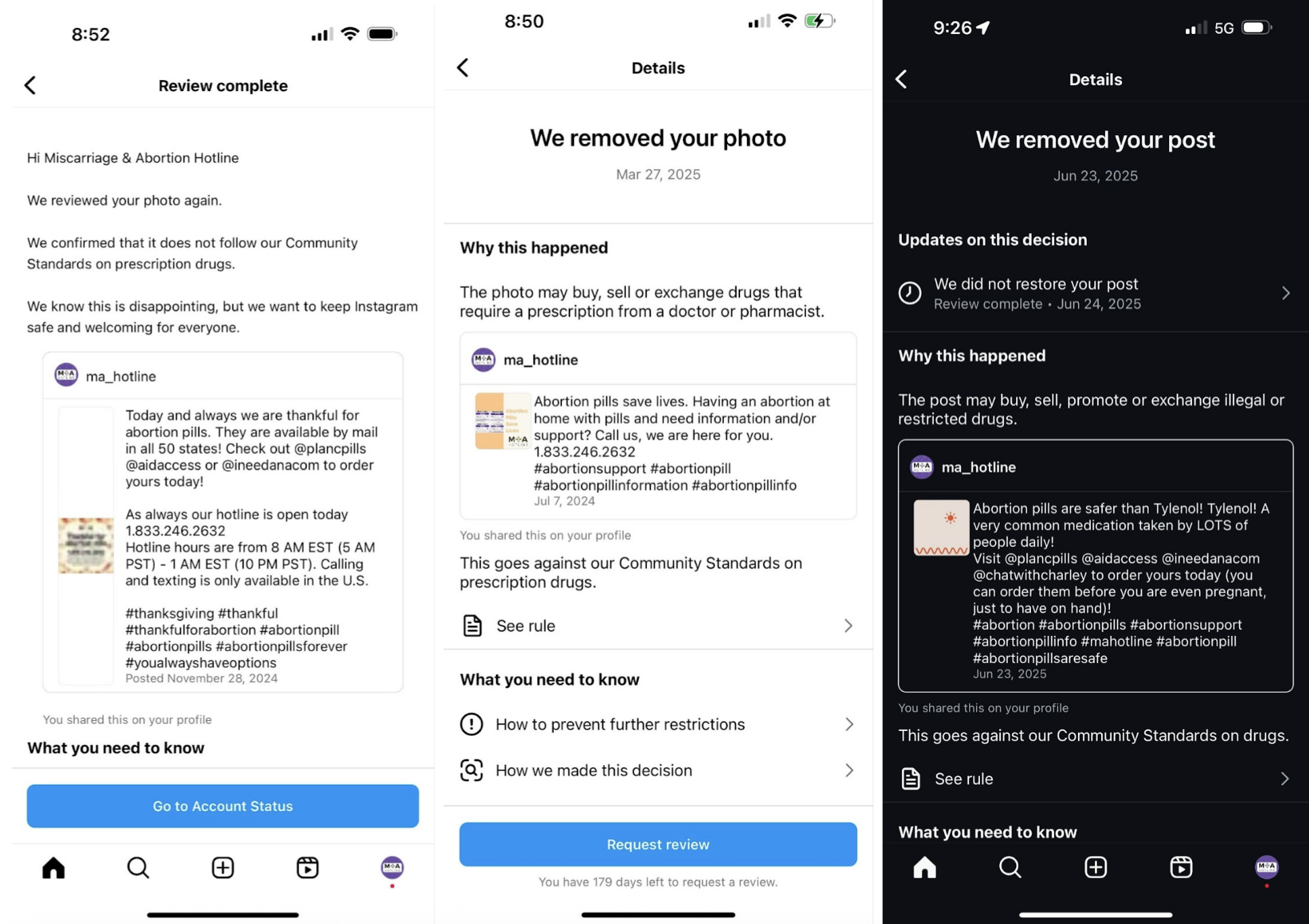 Like many reproductive health, rights, and justice groups, the M+A Hotline is active on social media, sharing posts that affirm the voices and experiences of abortion seekers, assert the safety of medication abortion, and spread the word about the expert support that the hotline offers. However, in late March of this year, the M+A Hotline’s Instagram suddenly had numerous posts taken down and was hit with restrictions that prevented the account from starting or joining livestreams or creating ads until June 25, 2025.