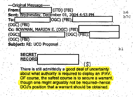 Eventually, the FBI seems to have sought a legal opinion on the proper use of the tool, both from the Office of General Counsel and from the National Security Law Branch,19 and ultimately, the agency seems to have settled on a "two-step request" process for CIPAV deployments -- a search warrant to authorize intrusion into the computer, and then a subsequent Pen/Trap order to authorize the surveillance done by the spyware.20