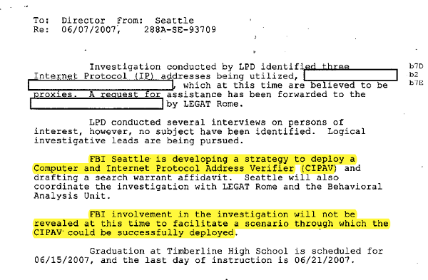 EFF recently received documents from the FBI that reveal details about the depth of the agency's electronic surveillance capabilities and call into question the FBI's controversial effort to push Congress to expand the Communications Assistance to Law Enforcement Act (CALEA) for greater access to communications data. The documents we received were sent to us in response to a Freedom of Information Act (FOIA) request we filed back in 2007 after Wired reported on evidence that the FBI was able to use “secret spyware” to track the source of e-mailed bomb threats against a Washington state high school. The documents discuss a tool called a "web bug" or a "Computer and Internet Protocol Address Verifier" (CIPAV),1 which seems to have been in use since at least 2001.2