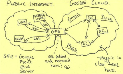 A chilling back-of-the-napkin sketch obtained by the Post depicts user data protected by SSL/TLS encryption as it traveled over the public Internet—but unprotected and exposed to spying within the companies' internal infrastructure.