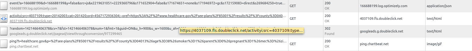 In the above example, a URL at doubleclick.net is requested by your browser. Appended to the end of this URL is your age, smoking status, preganacy status, parental status, zip code, state and annual income. This URL is requested by your browser after you fill out the required information on healthcare.gov and click the button to view health insurance plans that you are eligible for.