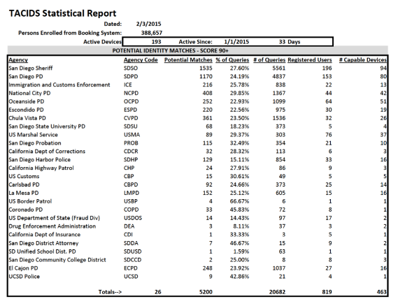 As of February 2015, 26 local, state and federal agencies in the San Diego County region are participating in the TACIDS program. Together, the agencies have a total 463 facial-recognition devices, although only 193 devices were listed as “active.”