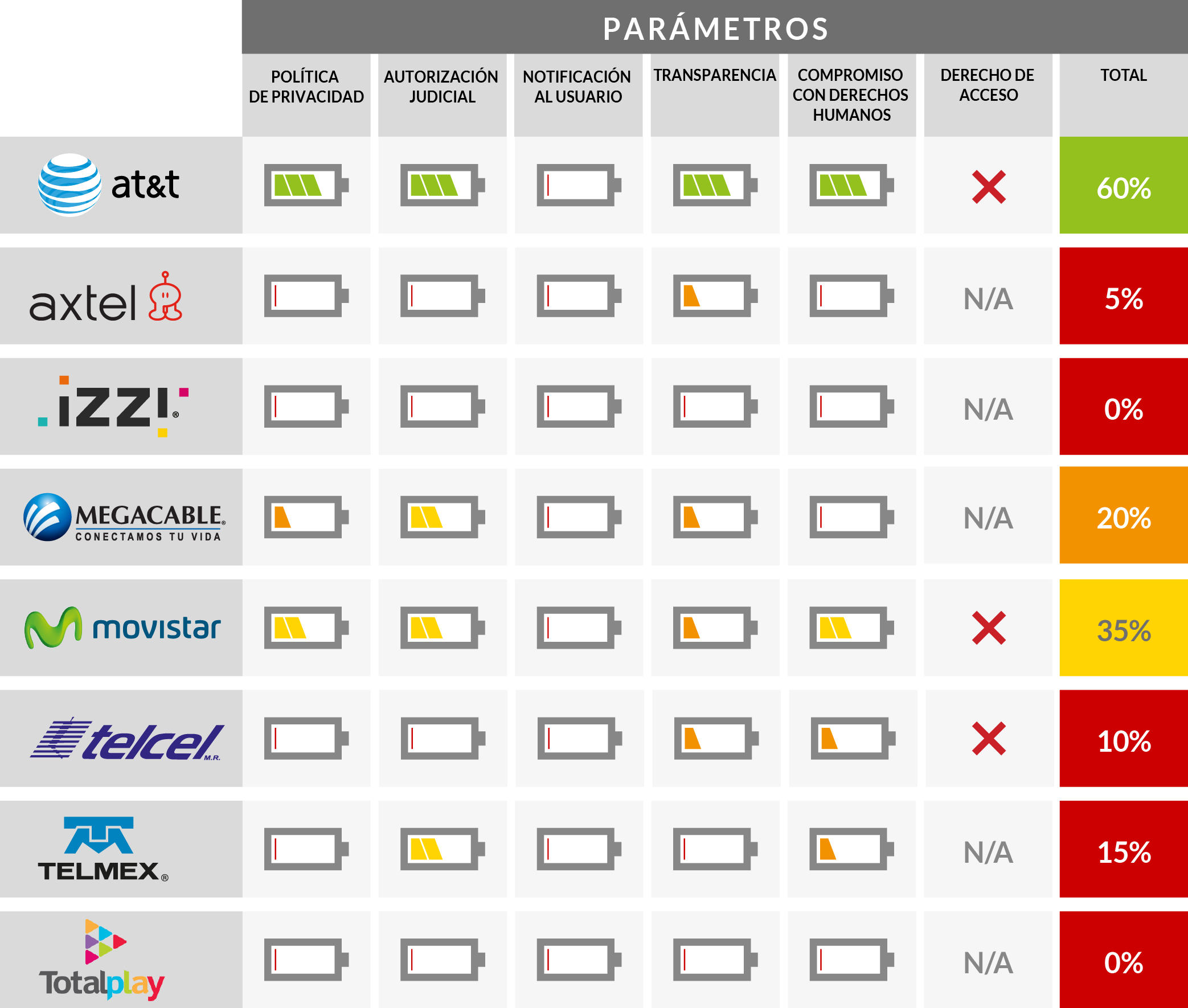 Since AT&T, Movistar, and Telcel didn’t grant their users access to their stored communications data, these companies received a negative grade.