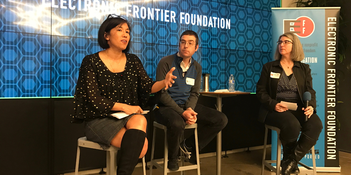 On March 2, EFF Executive Director Cindy Cohn sat down with Alexander Macgillivray and Nicole Wong, both former U.S. Deputy Chief Technology Officers (CTO) under President Obama as well as former legal counsel for Google and Twitter. The panel explored the development of the Obama administration’s policies on the Internet, intellectual property, and digital privacy and speculated on the future of the White House CTO position under President Trump. On March 3rd, we learned that Peter Thiel's former chief of staff Michael Kratsios will be stepping in to the role formerly held by Macgillivray and Wong.