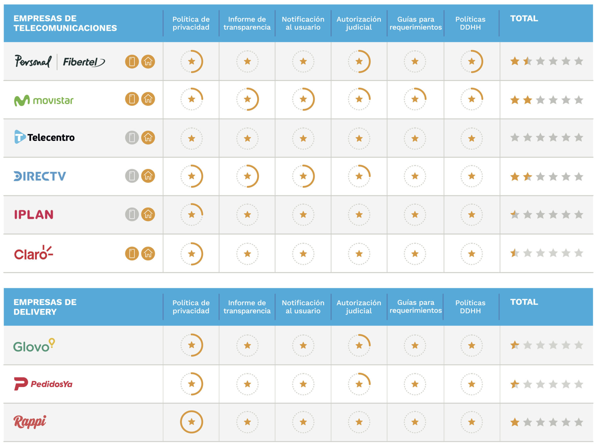 Las aplicaciones de servicio de entrega tienen una mejor calificación que los ISP en políticas de privacidad, pero no muestran muchas estrellas en otros criterios. La excepción es la categoría de orden judicial, en la que las Glovo y PedidosYa estipulan la entrega de datos personales cuando lo exige la ley, las autoridades competentes o tras una "solicitud legal previa". Sin embargo, no aclaran qué requisitos deben cumplirse ni qué tipo de solicitud legal es necesaria. Aun así, siguen estando por delante de Telecentro, IPLAN y Claro en este parámetro. Fibertel/Telecomunicaciones se destaca con media estrella por comprometerse a solicitar una orden judicial antes de entregar los datos personales. La empresa no recibió la puntuación completa ya que parece afirmar que la ley podría autorizar el acceso a los datos de las fuerzas del orden incluso sin una orden judicial. No se detallan los fundamentos legales o los datos que podrían ser entregados independientemente de una orden judicial.