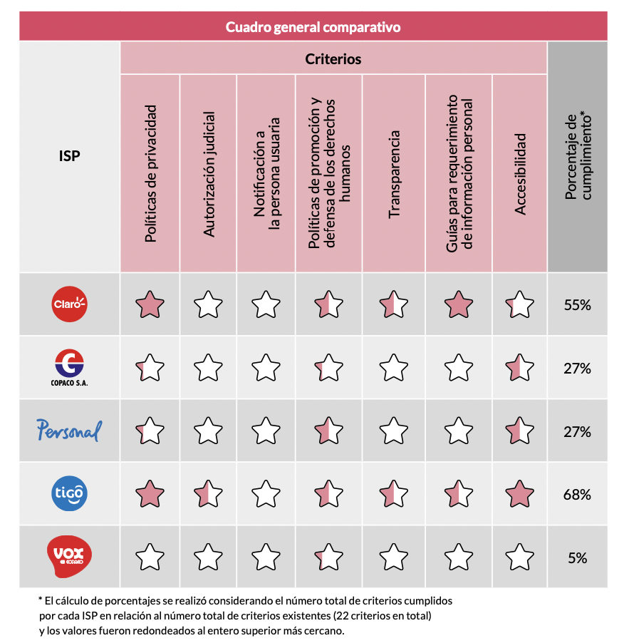El nuevo informe examinó los documentos y políticas disponibles públicamente de cinco empresas: Tigo (Millicom), Claro (América Móvil), Personal, Copaco y Vox. Todas han sido evaluadas por TEDIC desde la primera edición del informe en 2017. Desde entonces, Claro mostró notables avances en las categorías de política de privacidad e informe de transparencia. Tigo también ha mejorado las notas de sus políticas de privacidad y protección de datos a lo largo de los años. En esta edición 2022, Tigo mantuvo su posición de liderazgo, mientras que Claro se mantuvo firme en el segundo lugar. Copaco, que no recibió ningún puntaje en la última edición, compartió el tercer lugar con Personal este año. Por último, Vox se quedó muy atrás, obteniendo sólo un puntaje mínimo en una de las categorías evaluadas.