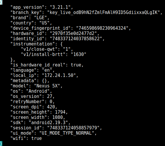 Branch, que se describe a sí misma como una plataforma de "enlace profundo", recibe una serie de identificadores únicos (device_fingerprint_id, hardware_id, identity_id), así como la dirección IP local de su dispositivo, modelo, resolución de pantalla y DPI.