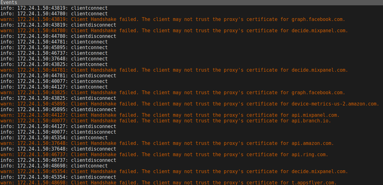 Nuestro análisis dinámico fue realizado usando mitmproxy corriendo en un punto de acceso para interceptar y analizar los flujos HTTPS de un dispositivo de prueba Android. Para eliminar el ruido generado por otras aplicaciones, instalamos la aplicación de cortafuegos AFWall+ y sólo permitimos el tráfico de red desde el Ring. El mitmproxy genera un certificado raíz x509 que debe ser instalado en el almacén de certificados a nivel de sistema operativo en Android, permitiendo que la interceptación activa tenga lugar en el tráfico que de otro modo sería seguro. Esto nos llevó al descubrimiento inicial de que el certificado raíz no estaba siendo aceptado como válido, y que alguna forma de fijación de certificados estaba siendo empleada por la aplicación.