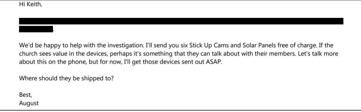 In another incident, the LAPD asked Ring for cameras to aid in an investigation involving a slew of church break-ins. Ring offered to send the police a number of cameras free of charge, but not without recognizing a marketing opportunity: “If the church sees value in the devices, perhaps it's something that they can talk about with their members. Let's talk more about this on the phone, but for now, I'll get those devices sent out ASAP.”