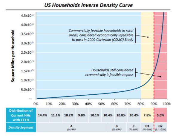 The command by Congress is significant when it states only economic or technical justifications will excuse discriminatory deployment. That is because the commercial feasibility of deploying fiber upgrades according to one study already reaches 90 percent of American households with the costs rising rapidly for the final 10 percent (see chart below). For the final 10 percent where it is commercially infeasible to deploy, Congress gave $45 billion to the National Telecommunications Information Administration (NTIA) to provide to the states to issue grants under the infrastructure law. In other words, the FCC is responsible for the other 90 percent of American broadband users when it comes to ensuring equal treatment of investments and upgrades under the bipartisan infrastructure law.