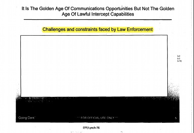 For example, a slide titled “Challenges and constraints faced by Law Enforcement” (EFF/Lynch 76) is almost completely blank. Similarly, the “recent examples” section of several slides titled “Legislative and Policy Challenge” (EFF/Lynch 95-102), has been blocked out (see example above). And all pages of the counterintelligence memo, which cryptically mentions a VoIP provider that could be Skype, are either almost completely redacted or withheld in full. (see EFF/Lynch 275-285)