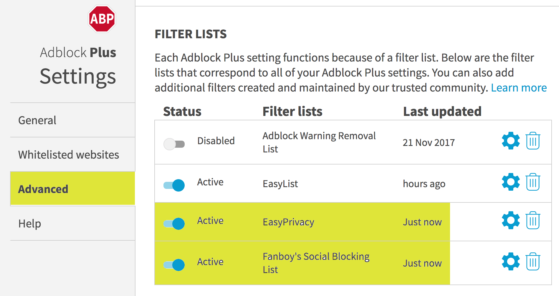 3. By clicking on the Advanced tab on the left-hand side, you can view the filters that are installed and active. EasyList blocks ads. EasyPrivacy blocks invisible trackers which are loaded regardless of whether ads are blocked. Fanboy's Social Blocking List replaces widgets such as the Facebook Like button that send information back to their owners whenever they are loaded on a web page.