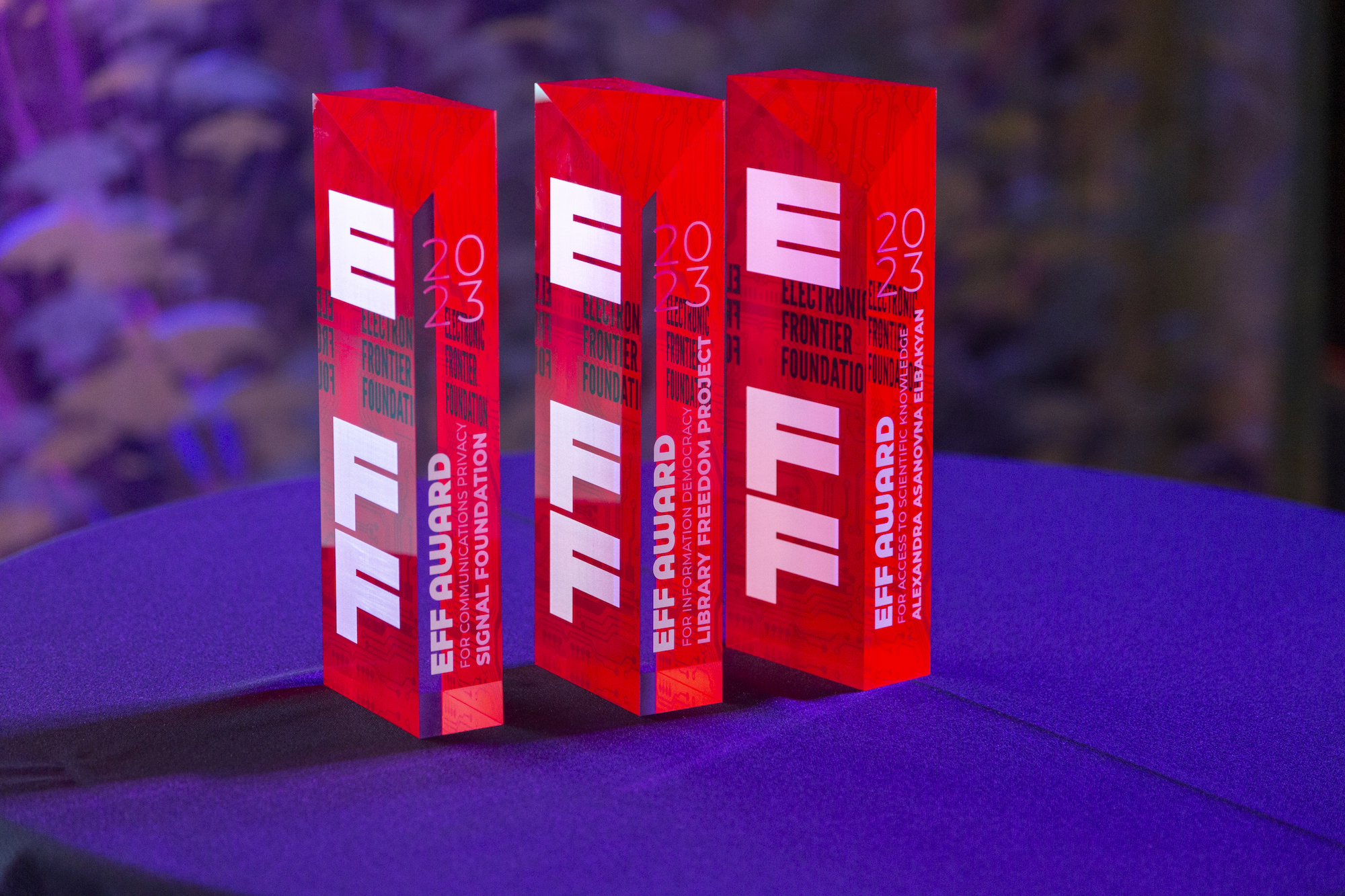 The reason EFF hosts our annual celebration, now known as the EFF Awards, is to celebrate those in the digital rights community who are pushing for privacy and innovation online. On September 14, we did just that. We presented awards to three winners: Alexandra Asanovna Elbakyan, Library Freedom Project, and Signal Foundation. These three honorees have contributed to a world where people can access and share knowledge online, grow and be a part of communities, and express themselves to others without being spied upon.