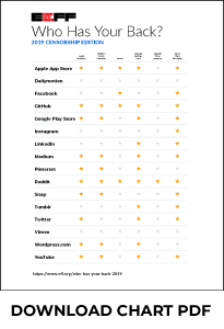 We are also pleased to see over half the companies in this year’s report publicly supporting the Santa Clara Principles on Transparency and Accountability in Content Moderation. These principles outline a set of minimum content moderation policy standards in three areas: transparency, notice, and appeals. This year’s Who Has Your Back criteria roughly mirror these areas, and reflect continued corporate progress toward fulfilling the spirit of the principles. The principles were released by EFF in conjunction with the ACLU of Northern California, Center for Democracy & Technology, New America’s Open Technology Institute, and a group of academic experts and advocates. Now, one year later, we are glad to see industry actors joining civil society and academia in indicating their support for the principles moving forward.