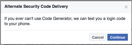 The first two prompts briefly describe how 2FA works on Facebook. Click through them to start and continue set-up.