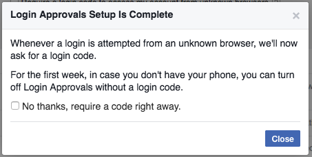 With 2FA setup complete, you have the option to “ease in” and cancel 2FA without your phone within a week. We recommend checking “No thanks” and securing your settings right away.